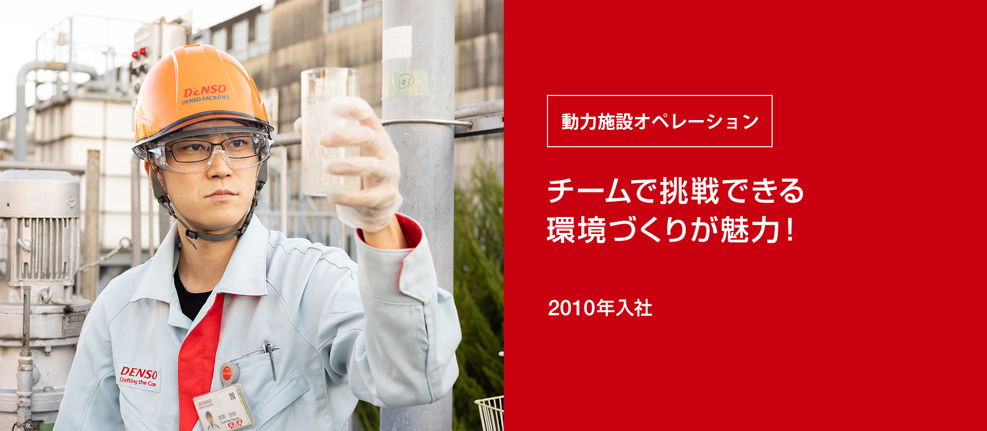 施設管理や排水処理等といったデンソーの生産現場を陰で支える仕事で、モノづくりに貢献したいと思い、入社しました。現在は、蒸気・圧縮エア・電気など、生産ラインに必要なエネルギーの安定供給や工場排水の処理をしています。私は主に排水処理を担当し、国の法律で定められた基準よりも厳しいデンソーの水質基準を超えないよう水質分析や計測機器の保全、負荷管理などを行い、排水処理場の運転管理に日々努めています。排水量や使用薬品量が急激に増えるなど、通常では想定できないトラブルも迅速に対応することが大切。1人では解決できないことも先輩や同僚に支えられながら解決し、その経験の積み重ねによって自分自身のスキルアップを実感しています。