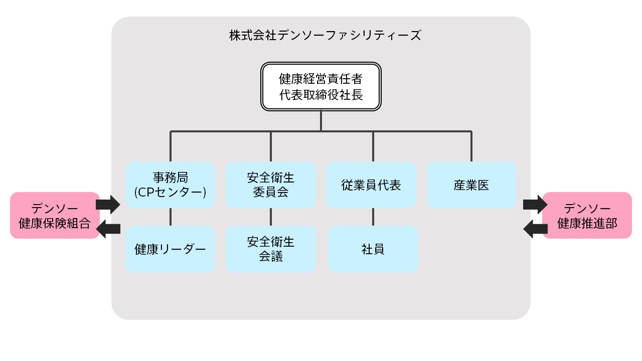 デンソーファシリティーズは、従業員の健康増進を経営課題の一つと位置づけ、2017年10月に「健康宣言」を発表するとともに、健康増進に向けた従業員の意識向上と職場での活躍促進を図るため、心身両面の健康施策の充実に取り組んでいます。