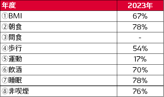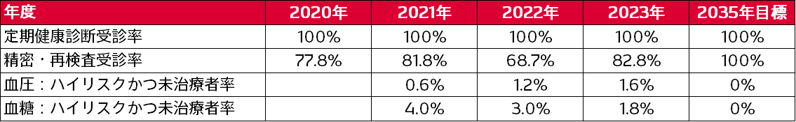 定期健康診断の全員受診継続、定期健康診断後の再・精密検査受診勧奨など治療への支援を実施し、病気の早期発見・早期治療に努めています。また定期健康診断結果より抽出した課題に応じた健康施策の実行と評価改善を健康経営の基本推進方針としており、健康行動の目標を数値化しています。
