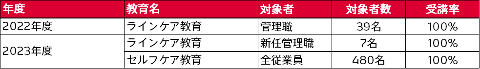 新任管理職にラインケア教育を実施しています。また、全従業員に対してセルフケア教育を実施しています。