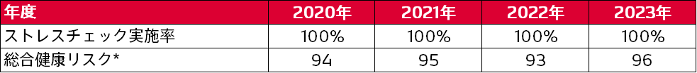 ストレスチェックの全員受検と、集団分析結果を職場にフィードバックし社員の心の健康づくりをサポートしています。また、高ストレス者には個別面談を行い、メンタル不調の早期ケアを実施しています。