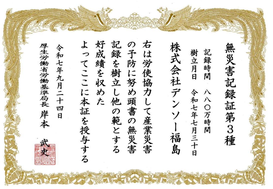 デンソー福島は無災害記録880万時間を達成し、12月4日に郡山労働基準監督署にて「無災害記録証第3種」を授与されました。