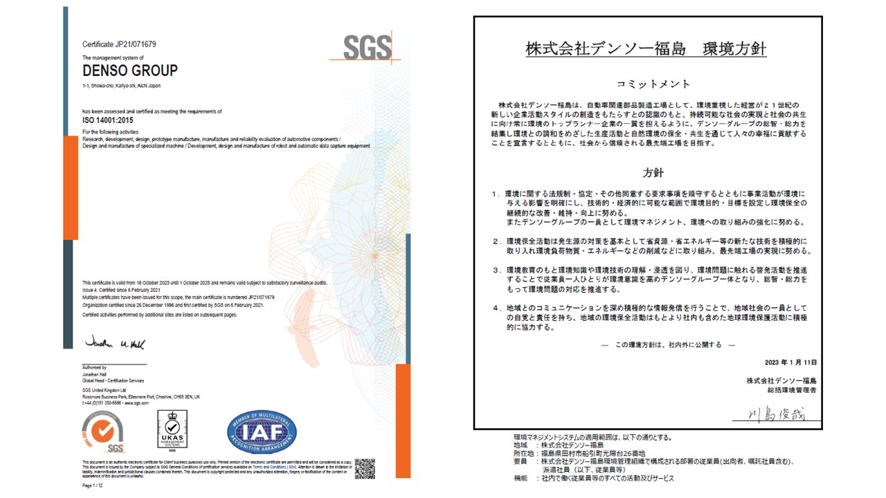 デンソー福島では、環境マネジメントシステムのISO14001を2013年度に認証取得し、2016年には大幅改正されたISO14001:2015年版への移行を早期に完了させ継続的な改善を行っています。