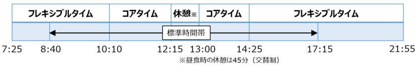 | 勤務時間 | ・8:40 ~ 17:15(所定労働時間7時間50分) ※業務の都合により、残業・深夜・休日勤務あり ※フレックスタイム制の適用あり(標準労働時間7時間50分) コアタイム 10:10 ~ 14:25 フレキシブルタイム 7:25 ~ 10:10 / 14:25 ~ 21:55 【勤務イメージ】 ![]() |