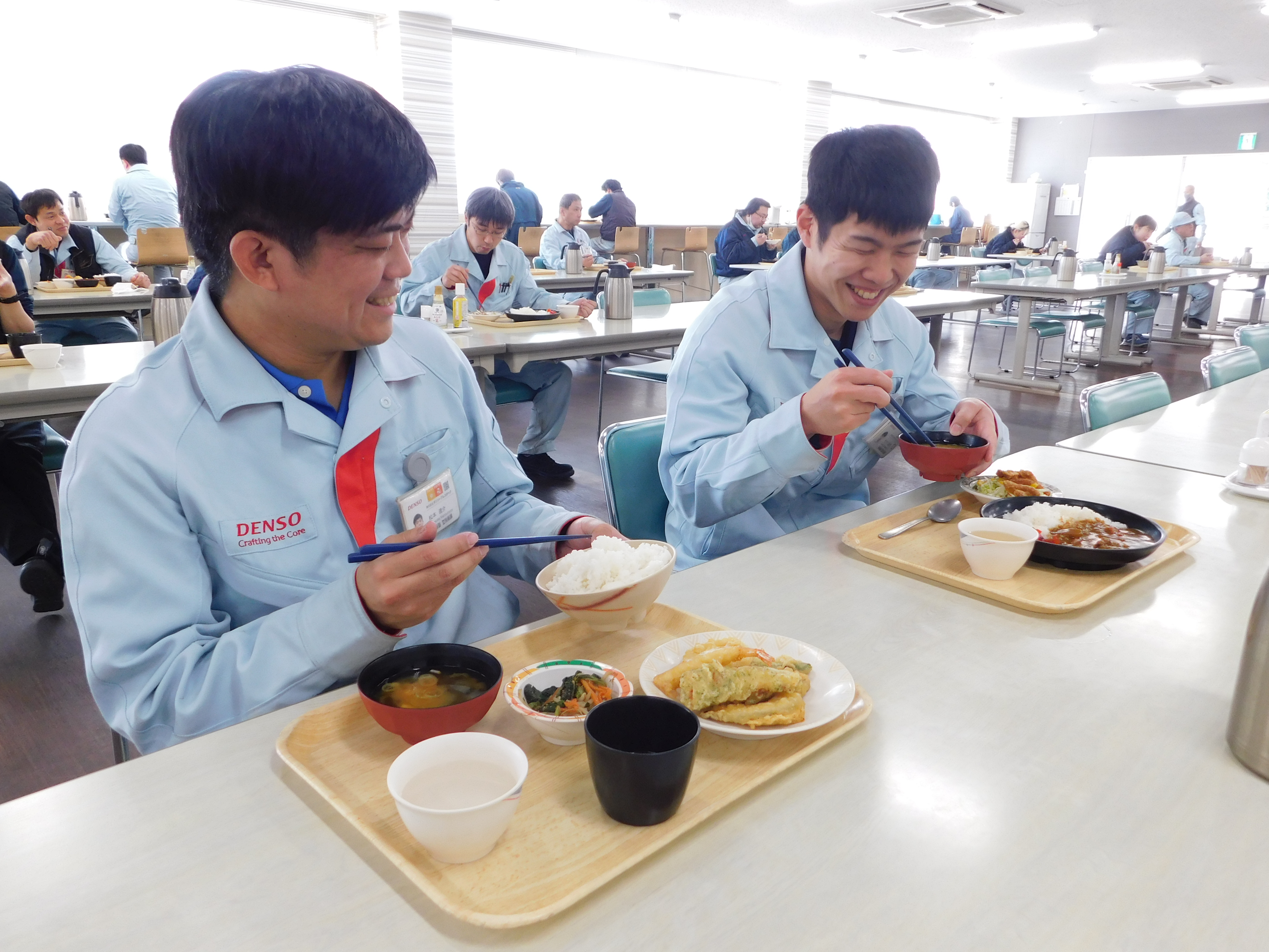 明るく開放感のある社員食堂で、季節を意識した食材やヘルシー志向等の豊富なメニューを取り揃えています。本社豊川工場では定食、丼ぶり、麺類の各種メニューから選択制、高浜工場ではカフェテリア方式を採用。食事代補助制度により安価で食事を提供して、社員の健康的な食生活を支えています。