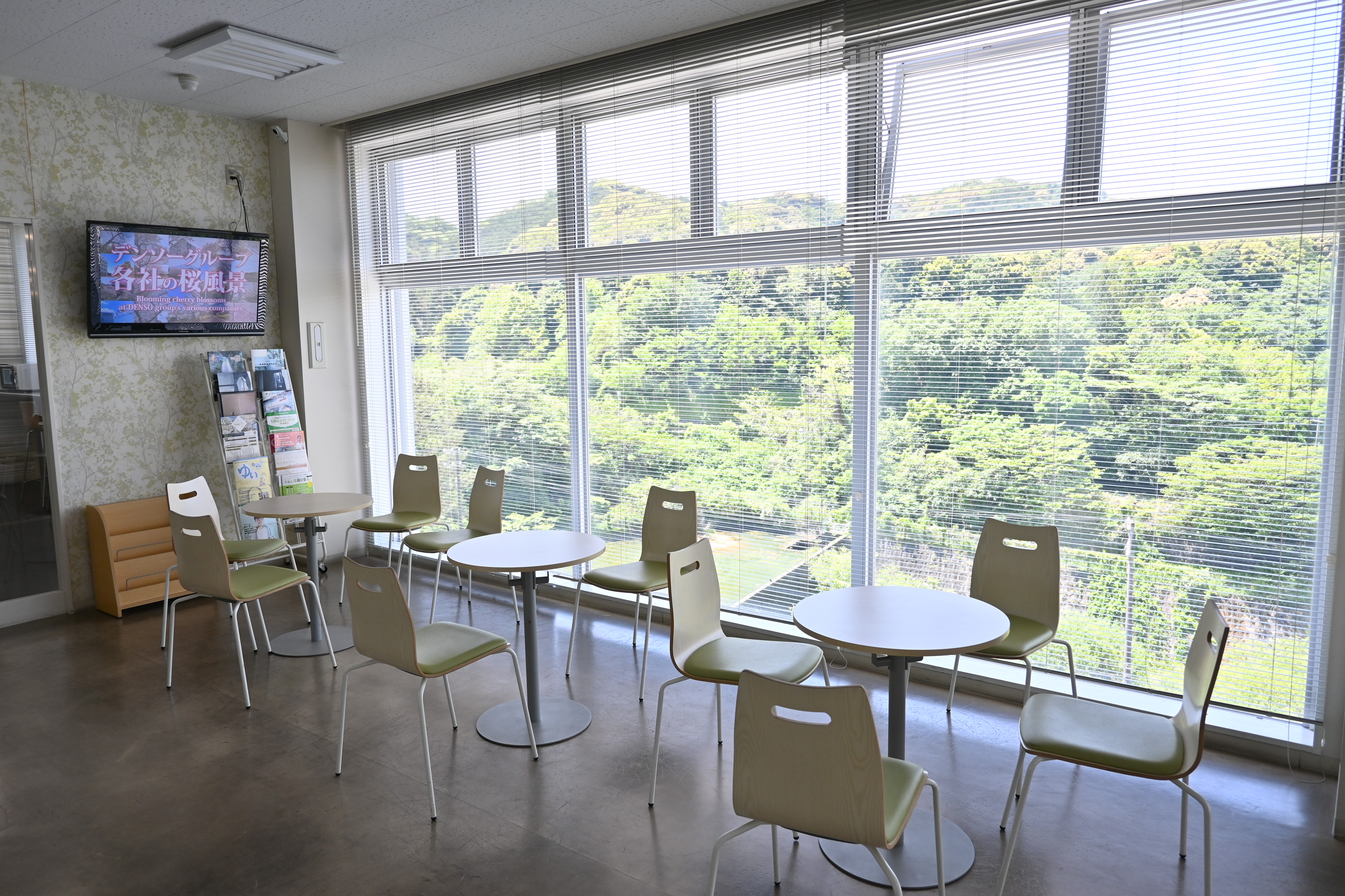 会社構内の各所に設けられたリフレッシュコーナーや休憩所でリラックス。自動販売機の種類も豊富です。本社豊川工場では、自慢の展望コーナーで自然観察をして、四季の変化を楽しむこともできます。休憩時間は仲間と楽しく語らいながらリフレッシュ、他部署の仲間との出会いやコミュニケーションの場にもなっています。