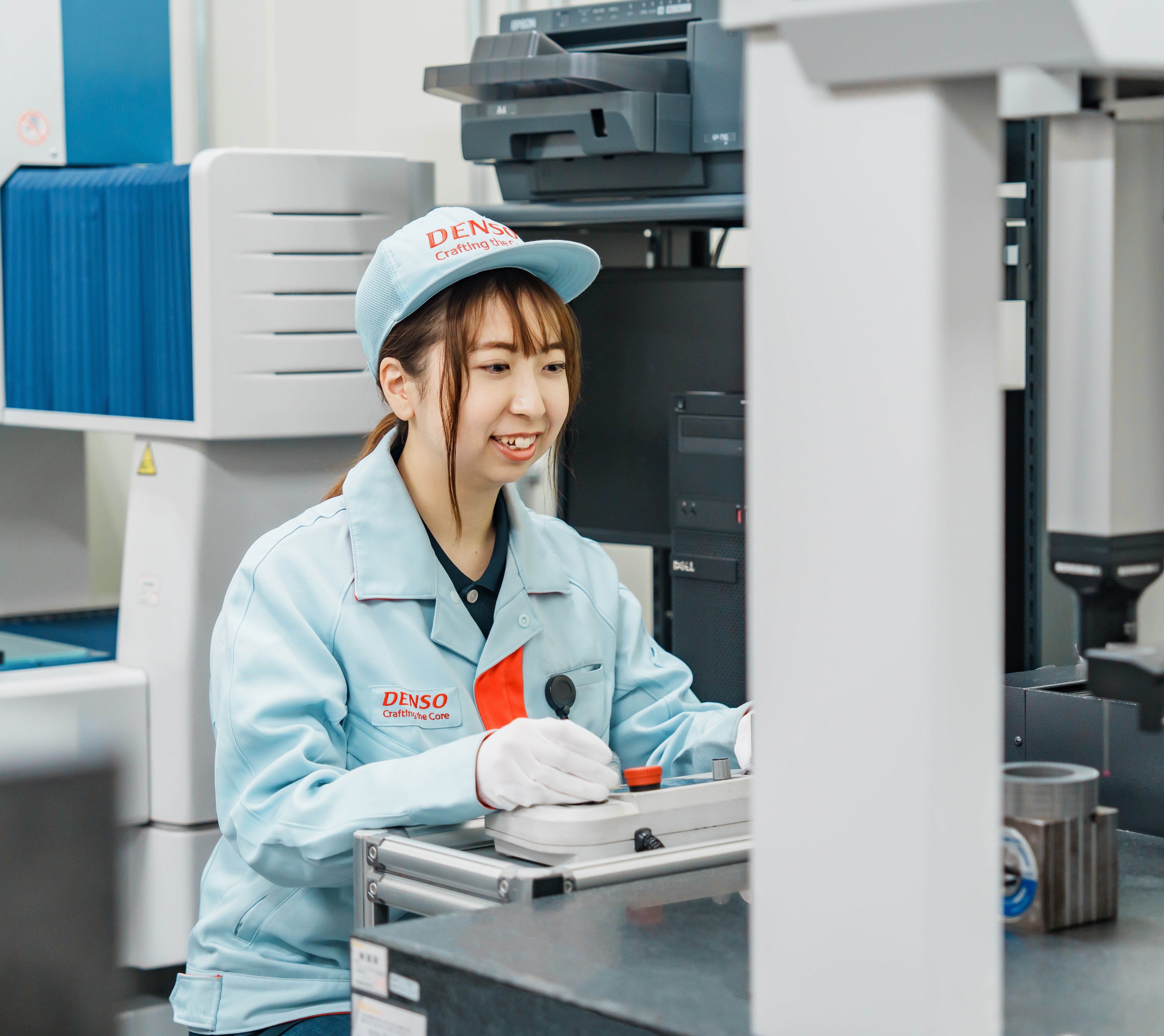 品質保証部 検査1課に所属し、デンソープレステックで生産した社内品と、取引先に依頼した仕入先品の検査を行っています。検査方法は見た目で判断する外観検査、測定機による数値の計測など多岐にわたり、不具合や不良を見逃さずに食い止めるのがミッションです。当社で生産する小さな部品の一つひとつが、自動車で大切な役割を果たします。わずかな不良が自動車のリコールにつながる可能性もあるので、検査の仕事は責任重大です。「デンソープレステックの品質を守る砦」だと意識して、日々検査に集中しています。