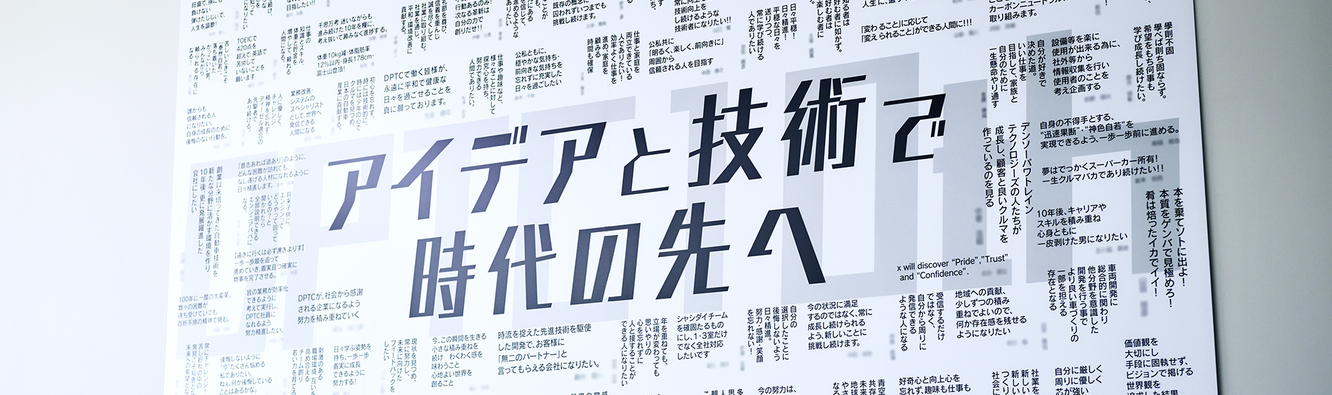 オフィスはワンフロア構造のため、部署を超えたコミュニケーションと交流が活発です。エントランスには社員の「10年後の目標」が飾ってあり、自動車業界を牽引するという社員一人一人の決意がこもったシンボルになっています。開発や試験に必要な設備も充実しており、実験やデータ解析に最適な環境を提供しています。また明るく広々とした社員食堂もあり、リフレッシュできる憩いの場となっています。