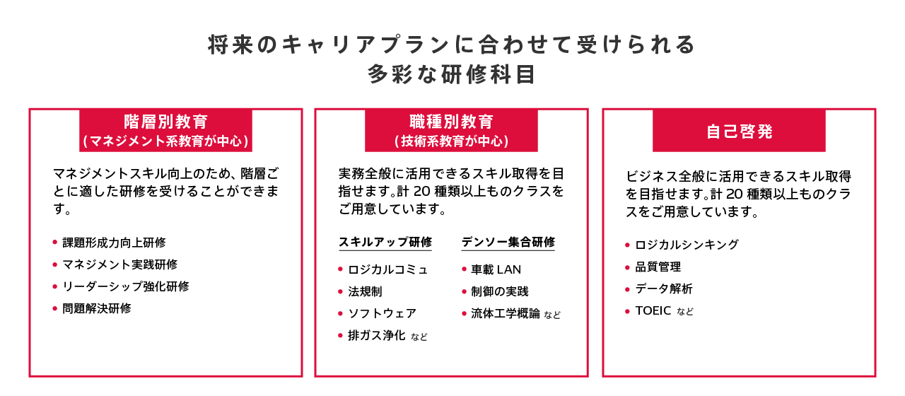 私たちは持続的なイノベーションを起こすために、社員の学ぼうという意思とスキルアップが欠かせないと考えています。そのサポートのため、幅広い研修制度の中から個人にあったものを選んで学べる環境を整えています。