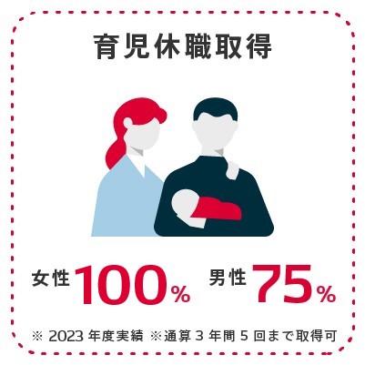 産前産後休暇・育児休職、介護休暇・介護休職、短時間勤務など、仕事と育児・仕事と介護の両立を支援するための各種制度があります。通算3年間5回まで分割取得が可能です。