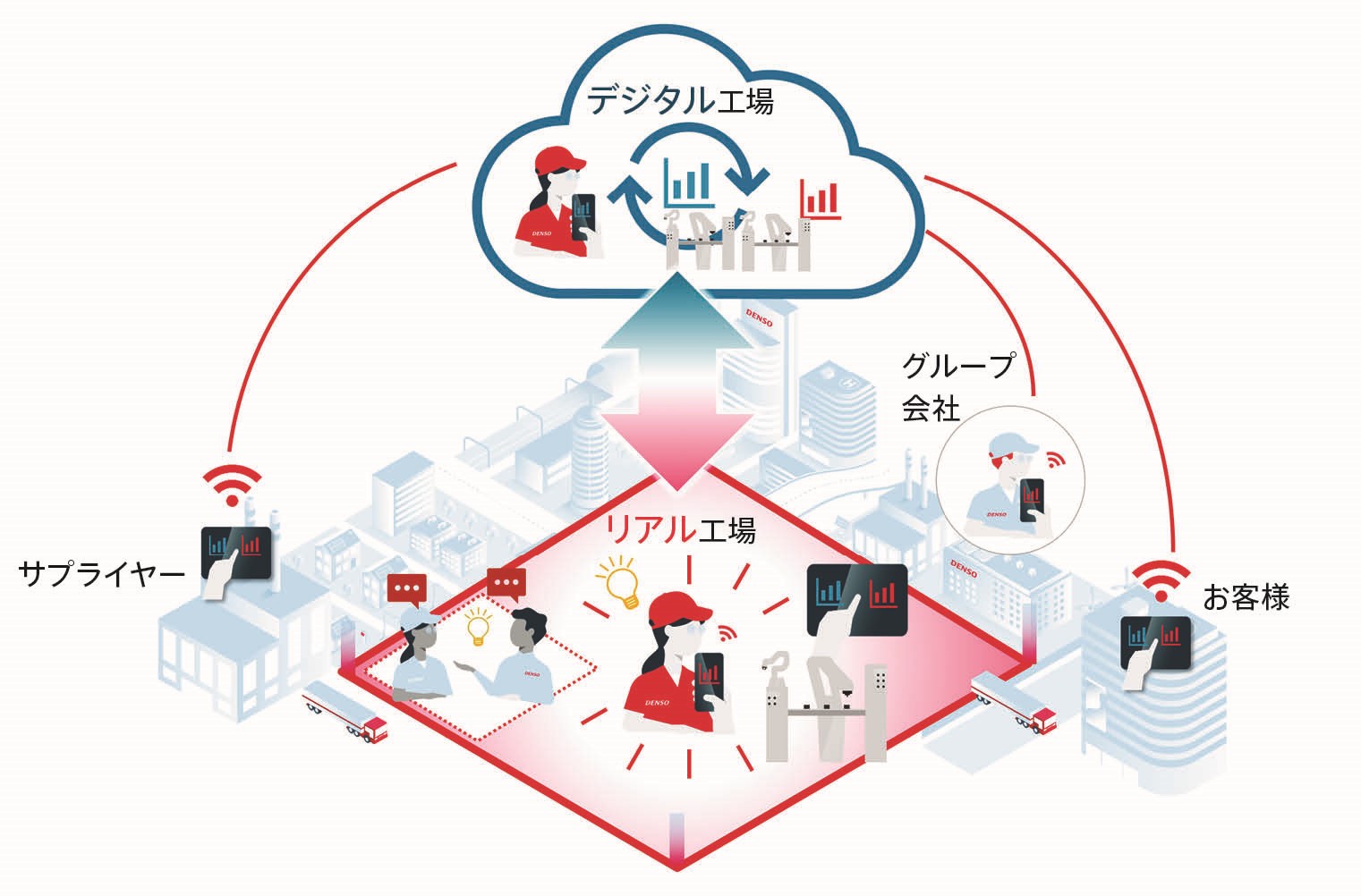 これまでデンソーのモノづくりは高生産性、高品質を重点に取り組んできましたが、モノづくりの取り巻く環境は、DX、カーボンニュートラル、労働力不足、多様なリスク対応など過去にない不確実な時代に直面しています。私たちは、デンソー流デジタルツイン工場によって、お客様に良い製品をこれまで以上にタイムリーにお届けすること、そして、デジタルに強い新しい世代の人を中心に社会課題の解決に貢献したいと考えています。