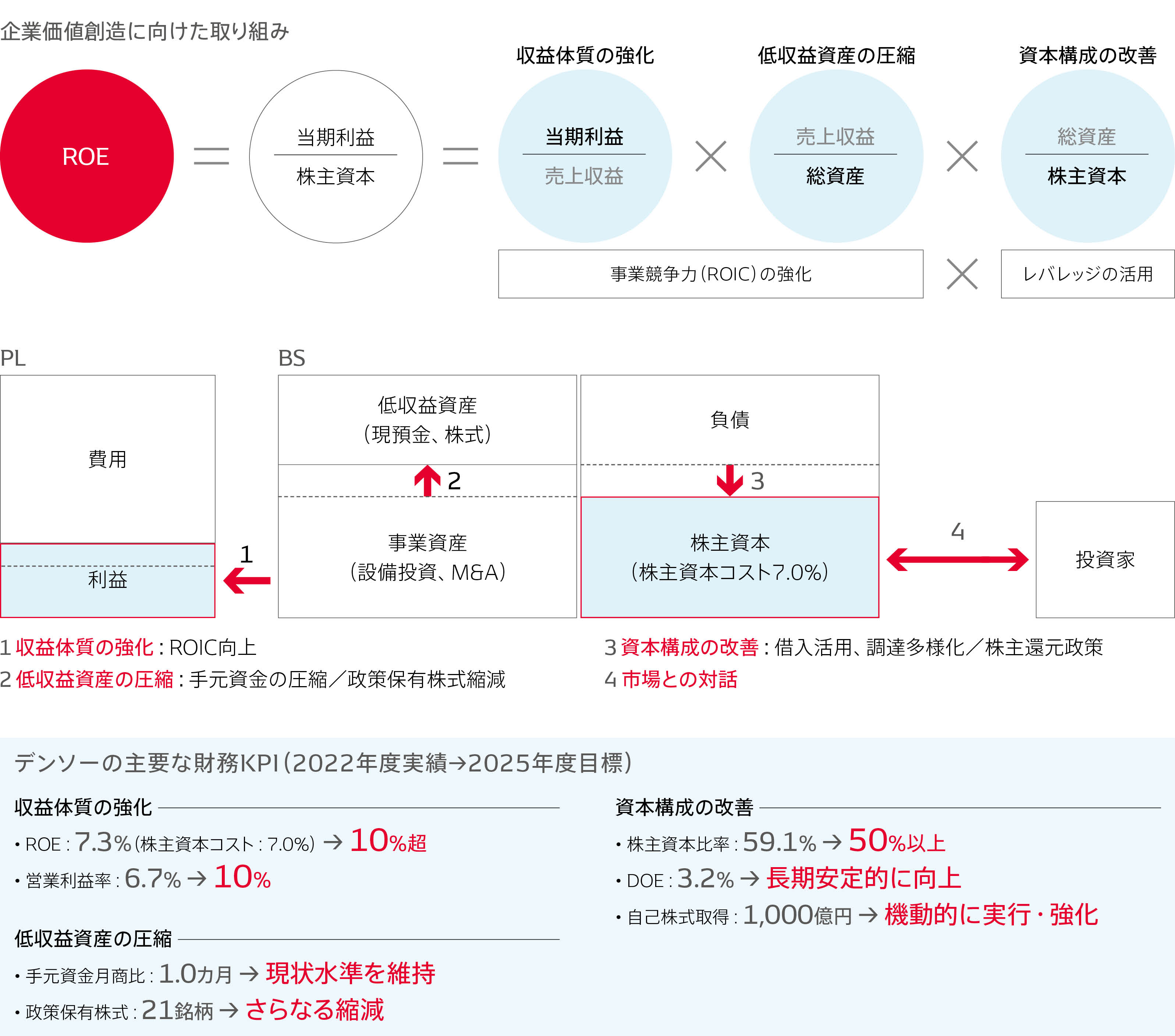 投資家やアナリストの皆様への適時・適切な情報発信と、役員参画の対話を進めることで、市場との情報の非対称性を縮小し、株主資本コストの低減によるエクイティスプレッドの拡大を目指します。