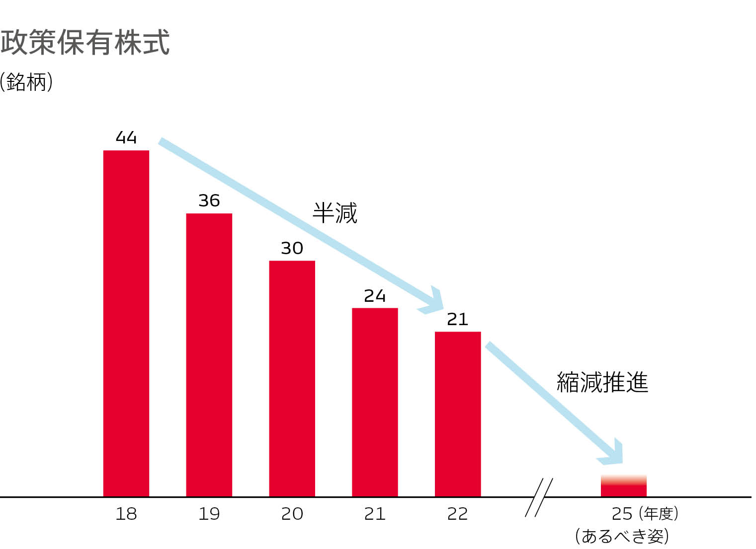 当社保有分のみならず、子会社が保有する上場株式も縮減検討の範囲と定め、コーポレートガバナンス・コードの対象を超えて、着実に縮減を進めています。2022年度は、一部売却を含めると、7銘柄を442億円で売却し、2018年度末からの4年間で44銘柄から21銘柄まで半減しました。今後もさらなる縮減を力強く推進し、創出したキャッシュを成長戦略上必要な投資につなげることで企業価値を創造していきます。