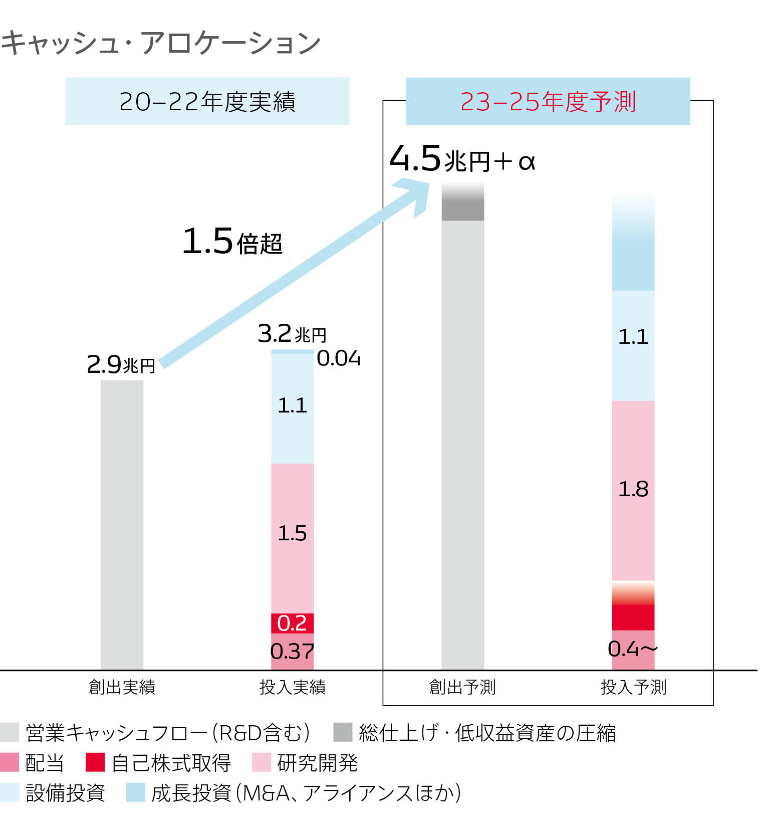 当社は、ROIC経営を通じて、収益体質を着実に強化してきました。その結果、キャッシュ創出においてはコロナ禍や半導体不足など外部環境が悪化する中でも、2020年度から2022年度までの3年間で累計2.9兆円の営業キャッシュフロー(研究開発費を含む)を創出しています。2023年度からの3年間では、さらなる事業ポートフォリオの入れ替えと低収益資産の圧縮を通じ、4.5兆円以上のキャッシュ創出を目指します。