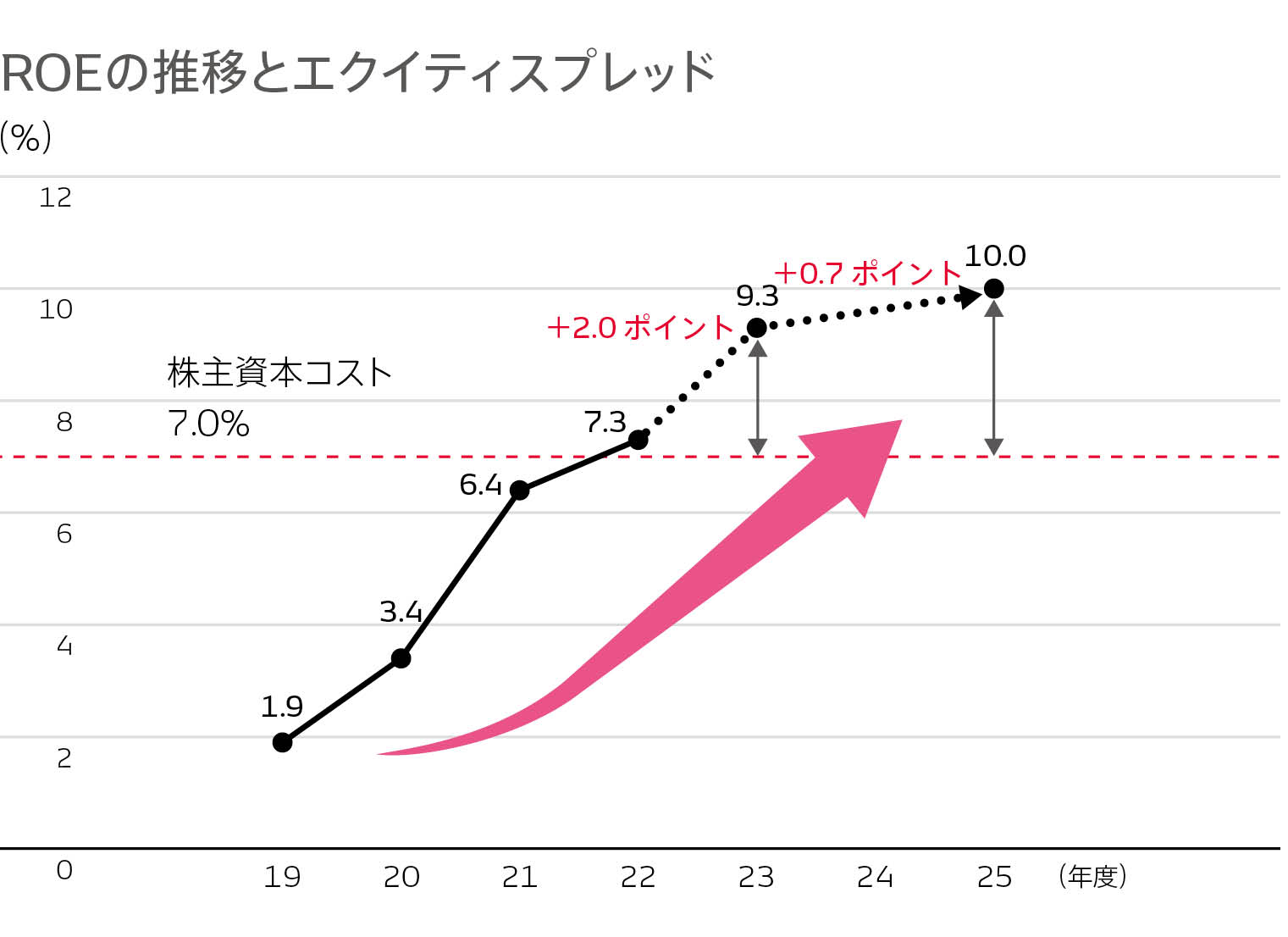 ROEにおいても、2022年度は、株主資本コストを上回る7.3%(前年度比プラス0.9ポイント)、2023年度はさらなる収益力強化により9.3%を見込み、2025年度の目標達成に向け、順調に進捗しています(2023年度第1四半期決算公表時点)。