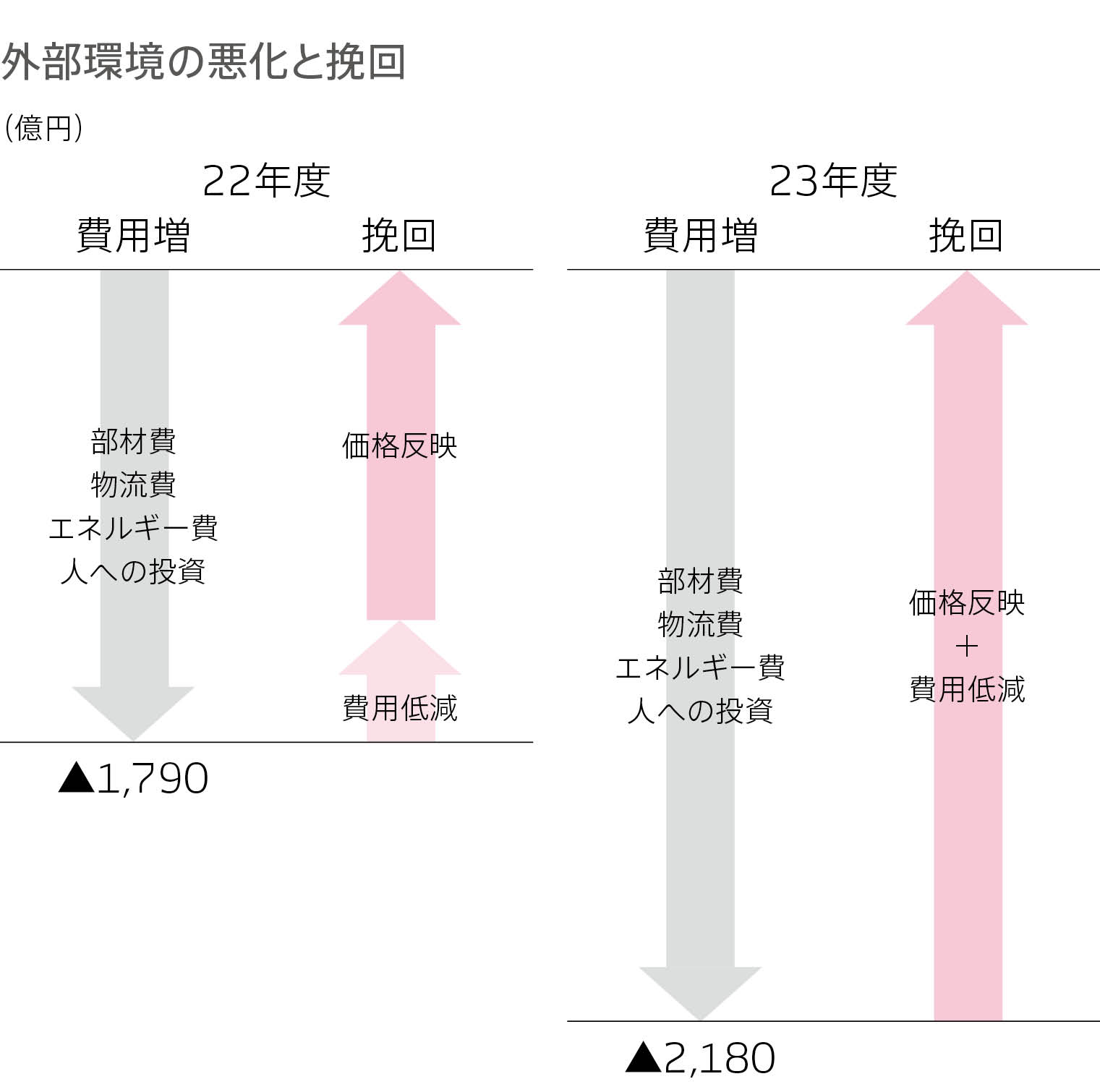 2023年度は、インフレや人財逼迫に伴う昇給も含めた「人への投資」の加速などを背景に、悪化影響は平時比で▲2,180億円を見込みますが、費用低減・価格反映の双方をより一層強化し、収益悪化の全額挽回に取り組みます。