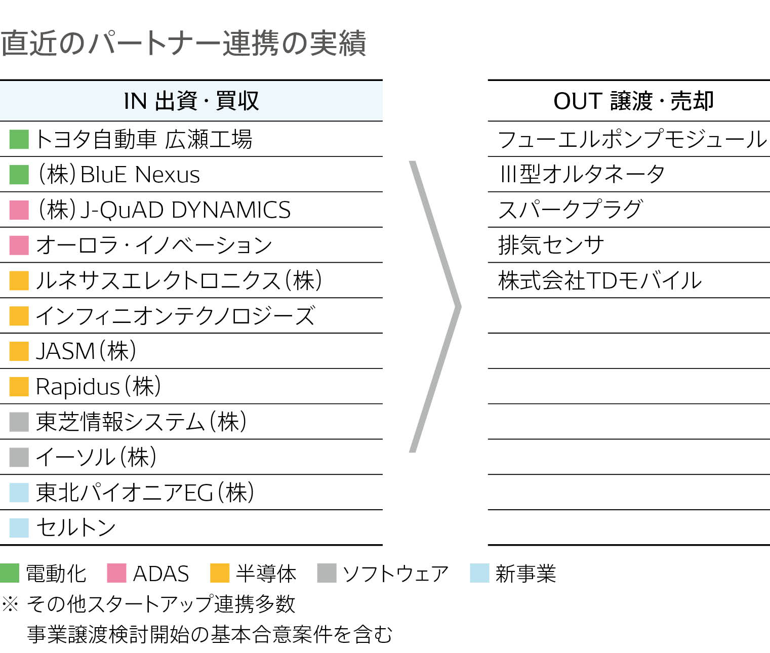 当社は、「電動化」「ADAS」「ソフトウェア」「半導体」「新事業」を重点領域と定め、各領域で全社横断タスクフォースチームを編成し、領域別の戦略検討を強化しています。各重点領域では、従来からパートナー連携を実施してきましたが、戦略実現に必要な手段となる連携先候補を早くから絞り込むことで、機を逸することのないパートナー連携を強化していきます。