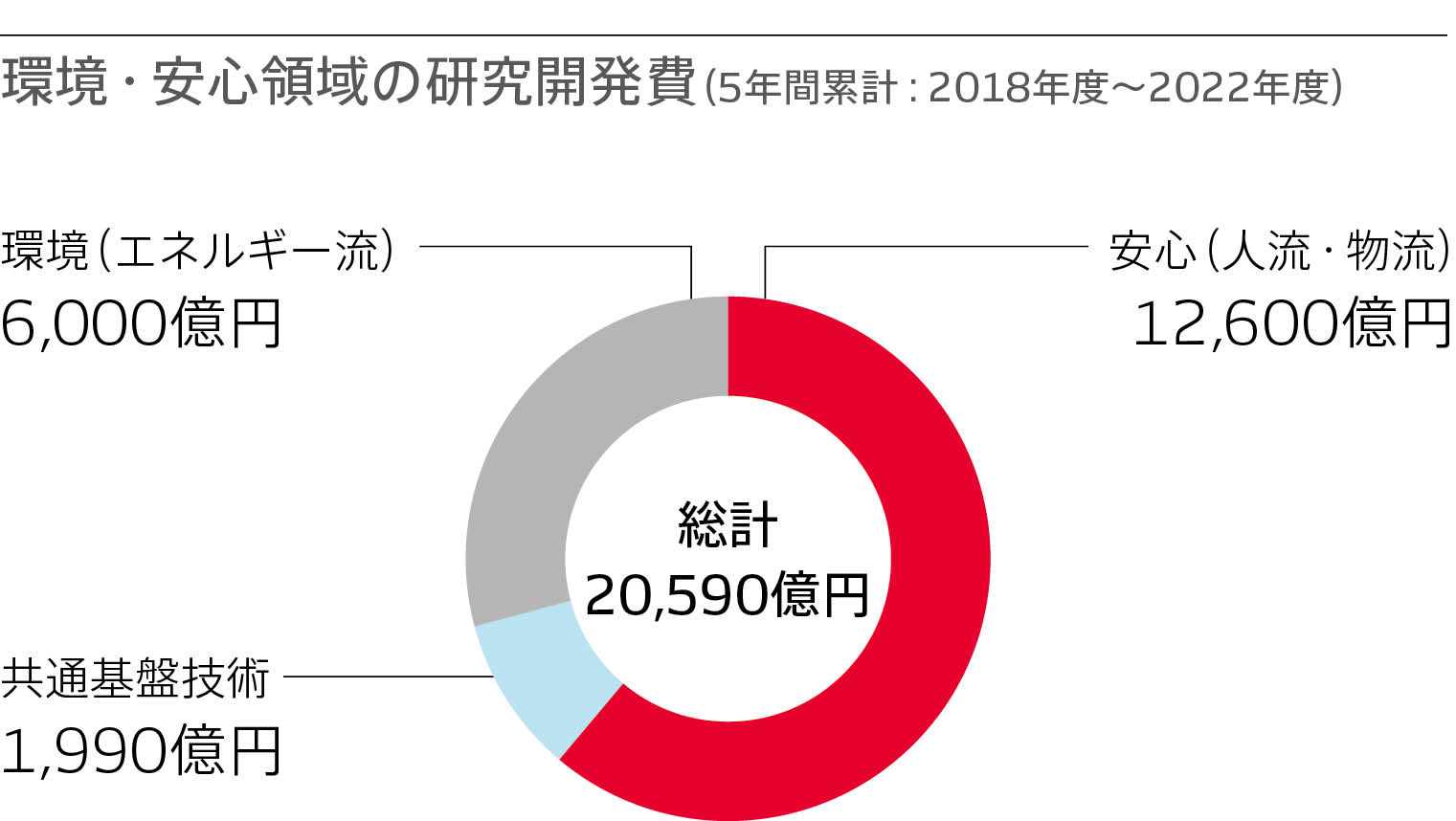 これまでの5年間で、環境領域では、電動化・カーボンニュートラルなど「エネルギー流」の技術開発に6,000億円、安心領域では、高度運転支援・自動運転など「人流・物流」の技術開発に1兆2,600億円、共通の基盤技術に1,990億円の経営資源を投入してきました。