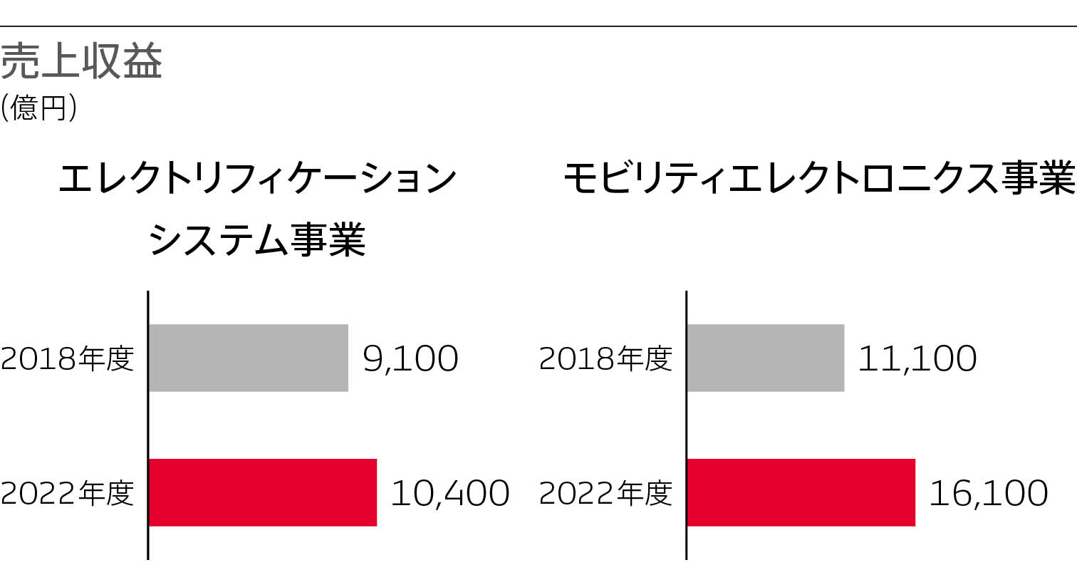 その結果、環境領域では、エレクトリフィケーションシステム事業グループの売上収益が、9,100億円(2018年度)から1兆400億円(2022年度)に成長しました。また、BEV向けに消費電力の大幅低減を可能としたSiCインバータの量産を開始しました。安心領域では、高度運転支援(ADAS)とシステム制御ユニットを中心としたモビリティエレクトロニクス事業の売上収益が、1兆1,100億円(2018年度)から1兆6,100億円(2022年度)と大幅に成長、その間にはADAS用センサシステム(GSP : Global Safety Package)の事故カバーシーンを拡大したGSP2、GSP3を世に送り出しました。さらに既販車向けアクセル踏み間違い防止後付け装置による安全装置の普及も推進してきました。