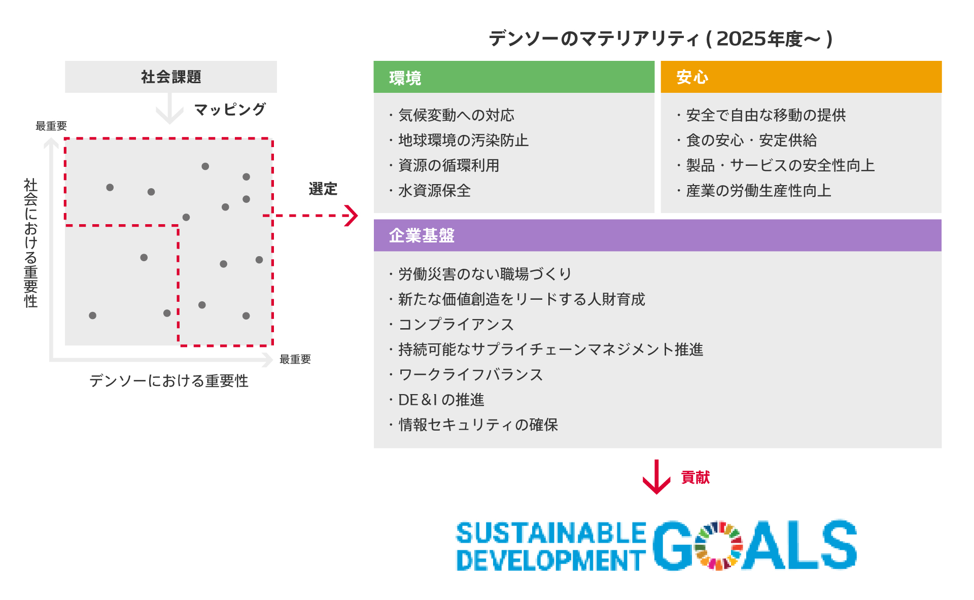 マテリアリティ案については、顧客・取引先・投資家・社員・地域といったバリューチェーンを代表する主なステークホルダーとの対話を通じていただいた意見やデンソーへの期待を反映、最終化しました。その後、経営レベルでの議論を経て、取締役会にて承認されています。