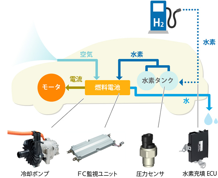 デンソーでは、水素を燃料に発電して動く燃料電池自動車(FC)の普及促進に貢献する技術開発を進めています。 これまでにパワーコントロールユニットやFC昇圧コンバータなどの高電圧・パワー系部品、冷却性能を大幅に向上させたラジエータや冷却ポンプなどの冷却系部品が、トヨタの燃料電池車「MIRAI」に搭載されています。 今後もハイブリッド車やガソリン/ディーゼル車で培った技術を活かし、燃料電池自動車の信頼性・性能向上とコストダウンの両立に貢献する製品を提供していきます。