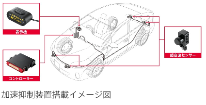 この製品は、駐車・停車状態からの発進時に、バンパーに取り付けられた超音波センサーが障害物を検知すると、表示機とブザーでドライバーに注意喚起、それでもドライバーがブレーキと間違えて強くアクセルを踏み込んだ場合には、加速を抑制し、衝突被害の軽減に寄与します。
