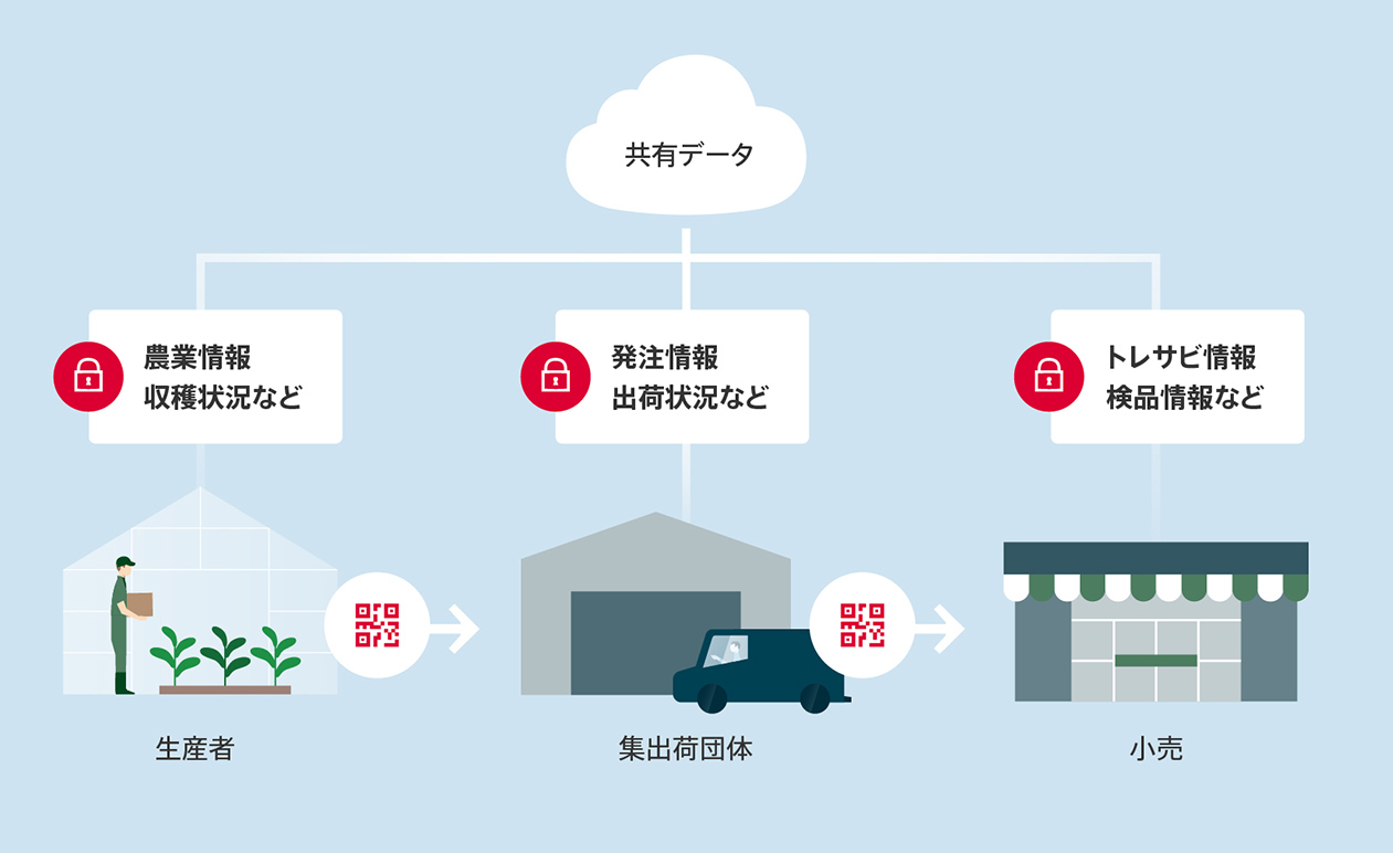 QRに紐づけた多種多様な情報・履歴を一元管理することで、食流通の様々なプレイヤーと、いつでもどこまでも情報共有・活用ができます。