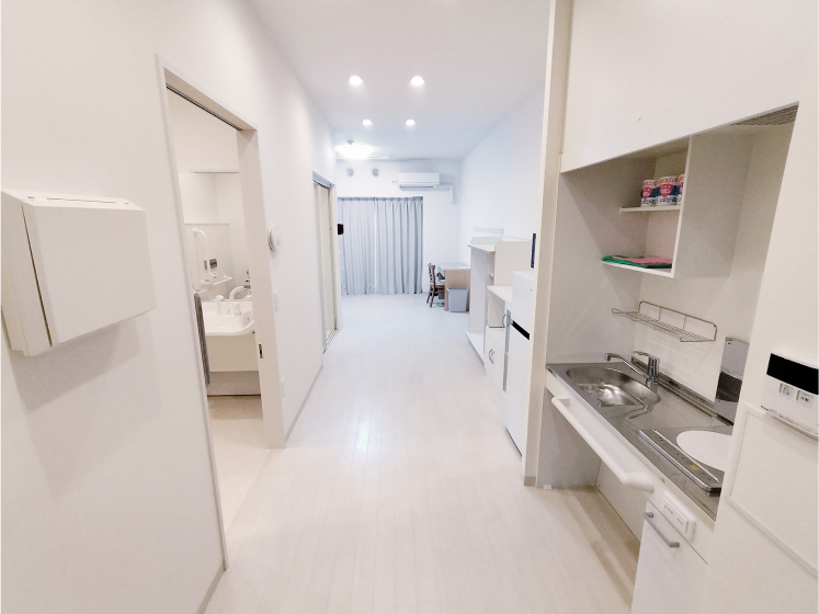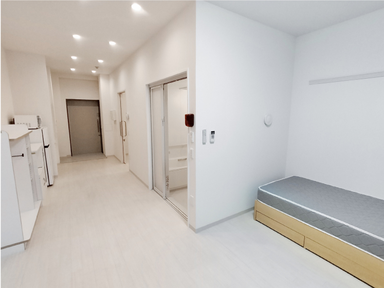 本社に隣接する社員寮「クレシア丸田」は、本社内のどの職場からも徒歩10分の便利な場所にあります。各部屋はワンルーム形式で広々としたリビングスペース、キッチン、快適なバスルームを備え、設備が充実しています。障がいのある方も安心して生活できるよう、エレベーターや共用部の段差を極力排除したバリアフリー設計、居室内でも車椅子での生活ができるよう配慮された個室完備、聴覚に障がいのある方のためのパトライトも設置されています。