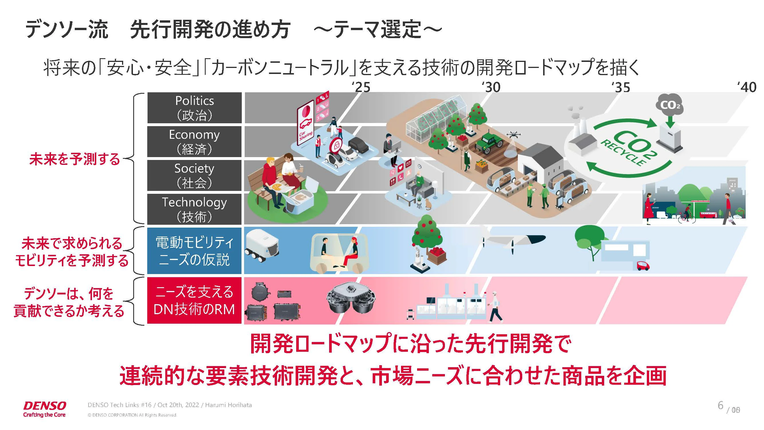 まずはテーマ選定です。デンソー流にいうと、フォアキャスト/バックキャスト視点で開発ロードマップを描くところが特徴的だと思います。