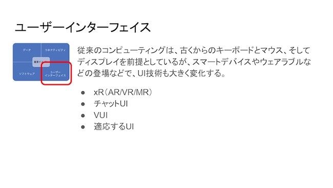 UIって、「そこにタンジブルなかたちで、ものが表示される」ということだけじゃないんですね。スマートスピーカーみたいに声で話しかけてくれるUIもあるし、ユーザーが自らそこにアプローチすることなく相手から歩み寄ってくれるようなものも、すべてインターフェースの新しいかたちなんです。こういったものが大事な要素ではないかと思います。