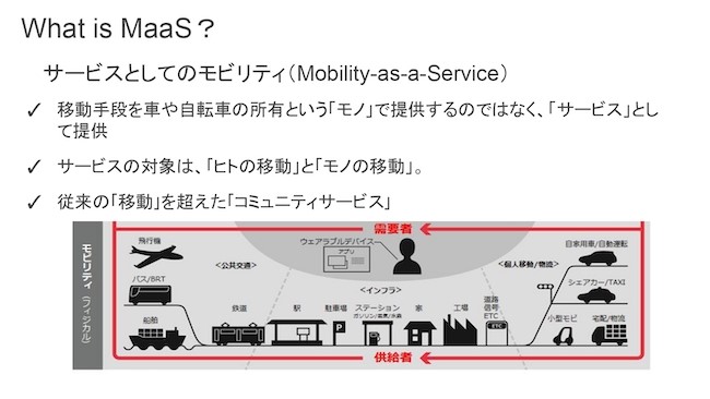 MaaSというのは、「人が移動する」「モノが移動してくる」など、いろんなものがあるんですけれども、キモはサービスなんです。自動車産業に限らず製造業というのは、先ほどのDevOpsよろしく「売って終わり」だったんです。家電もそうです。クルマもそうです。