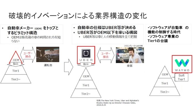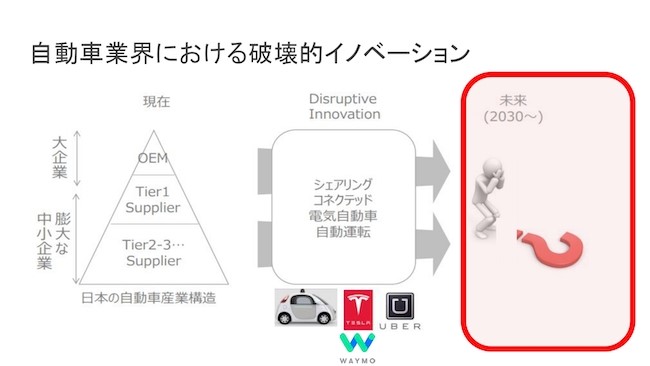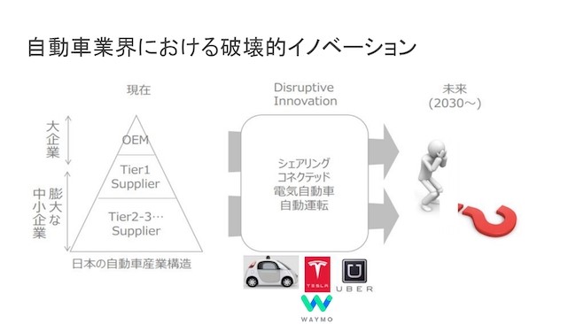 一方で、OEMメーカーでさえユーザーとの接点が持てているかというと、持てなくなっているかもしれない。実際にユーザー接点を持っているのはUberであったりTeslaであったりのサービス事業会社であって、カーメーカーでさえ、単にクルマのパーツを提供しているような存在になってしまうかもしれない。