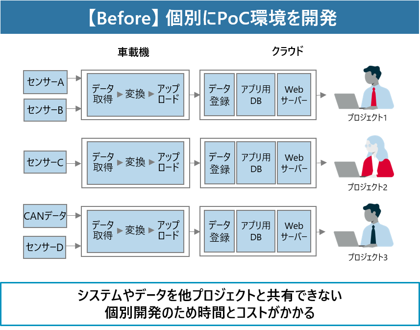 CASEの進展や未来のモビリティ社会を見据え、新たな領域の製品やサービスの開発を進めるデンソーでは、多様な開発プロジェクトが進み、膨大な数のPoCが行われています。プロジェクトごとにPoC環境を構築するため、システムやデータの再利用が難しく、また、構築や運用に関するノウハウも蓄積されていかず、多くの時間とコストがかかっていました。D-toteはこのような課題感を背景に開発されており、PoCプロセスをDXにより効率化することで、製品やサービス開発のスピードアップを実現します。