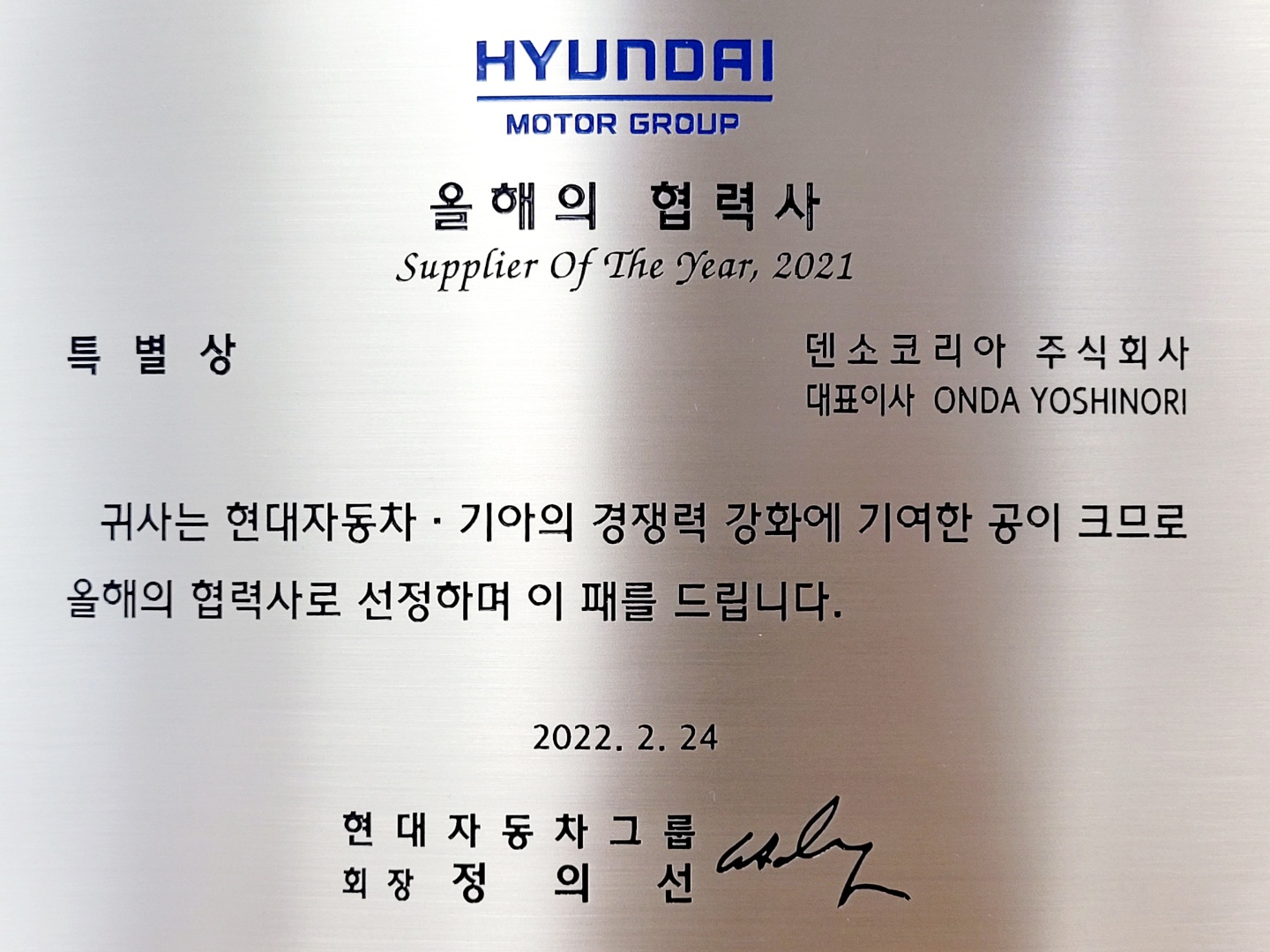 덴소코리아, 현대자동차그룹으로부터 '2021년도 올해의 협력사-특별상' 수상