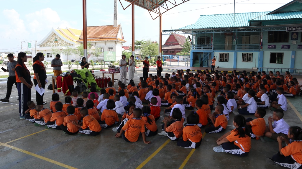 Siam DENSO Manufacturing Co., Ltd., Siam KYOSAN DENSO Co., Ltd., and Amata Facility Service Co., Ltd., jointly conducted “2018 Basic Fire Fighting and Evacuation Fire Drill Training” at Wat Ban Kao School. A total of 286 teachers and 1st - 6th grade students were trained in the activity. The companies organized the activity for two consecutive years, aimed to enable them to deal with fire situations on an emergency basis which conformed to Eco & Safety School project implementation.