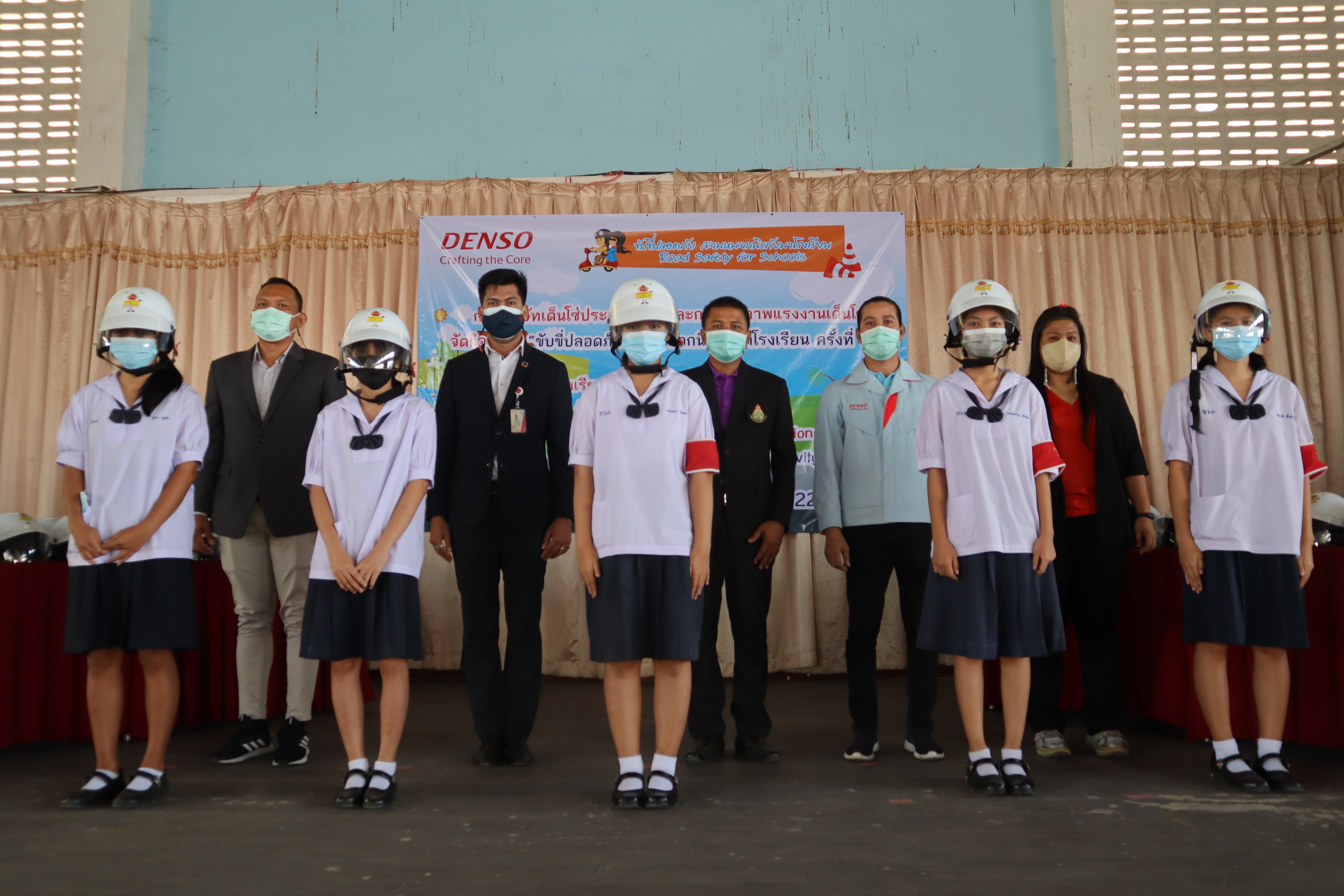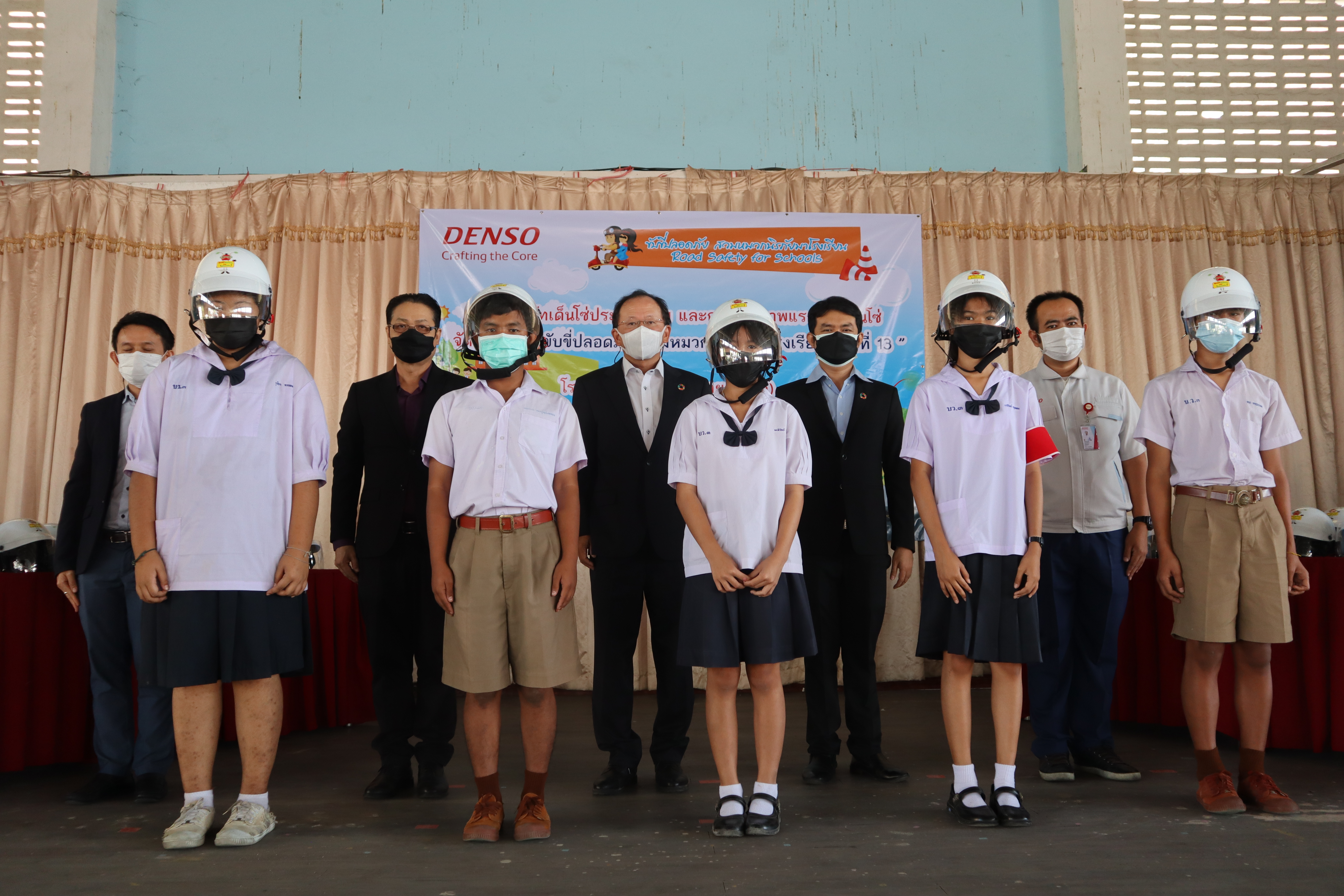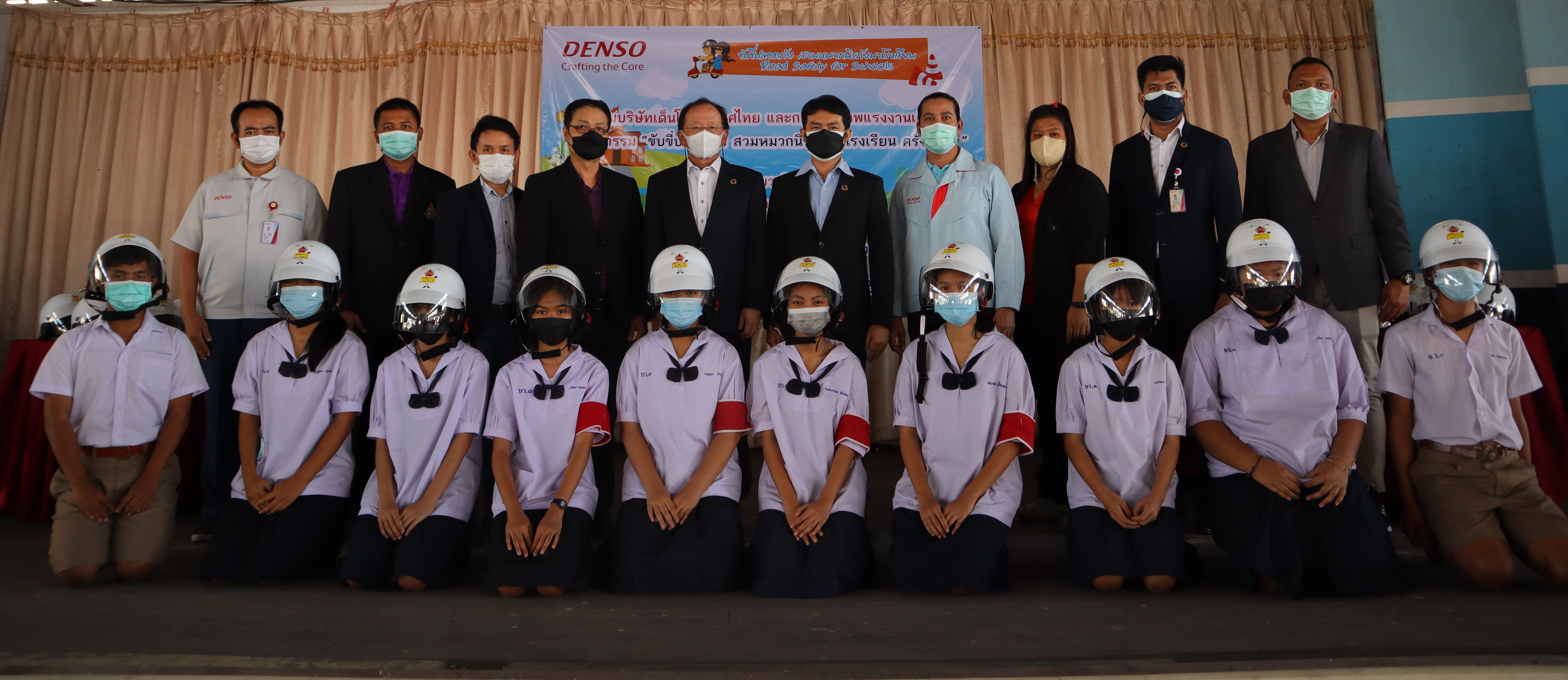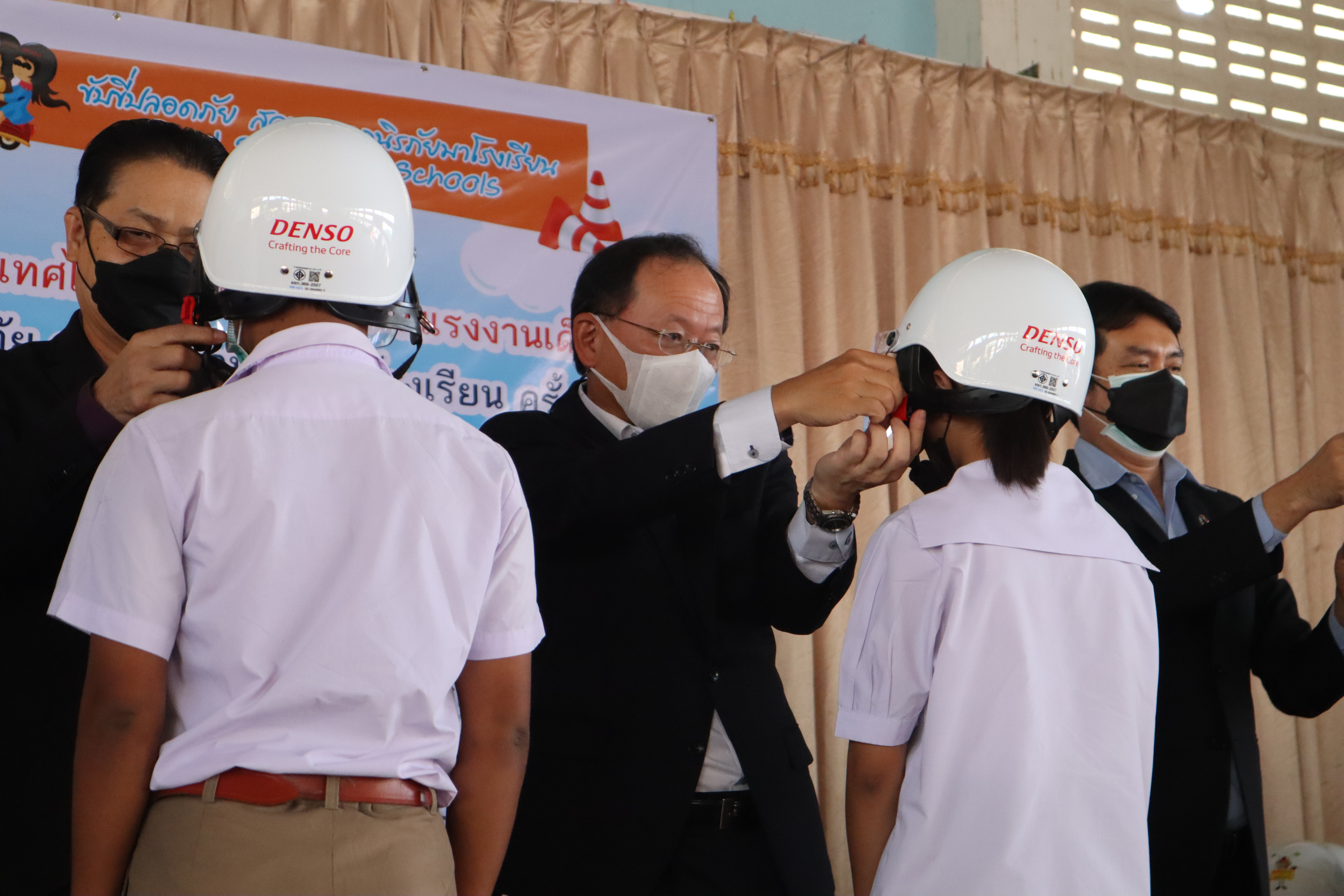On January 18, 2022, Mr.Hiromichi Morita, President of DENSO (Thailand) Co., Ltd. (DNTH), Mr.Kittisak Athisakunsap, Chairman of DENSO Thailand Workers' Union, Mr. Narong Praphasi, Chairman of DENSO Electronics Thailand Workers’ Union and Mr.Parinya Ketkam, General Manager of DENSO International Asia Co., Ltd. (DIAT) together with the management and committees of DENSO Thailand Workers' Union as the representative from Thai DENSO Group provided 275 helmets to Wat Lang (Bavorn Wittayayon 3) School students, Chachoengsao province. This helmet provision is an activity under the project of “Road Safety for Schools”. The activity aims to promote road safety awareness and reduce road accident fatality for motorcyclists.